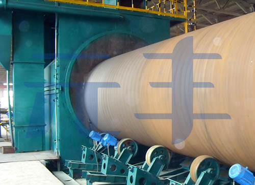 拋丸除銹機是利用高速旋轉的拋丸器帶動彈丸并使之加速同時拋出,打擊鋼管外壁,去除鐵銹、軋鋼鱗片、油脂、灰塵、漆、水分或其他沾染物。從而達到去除焊接應力,增加鋼管表面的錨紋深度,增強鋼管表面的附著力,有效增強了聚氨酯保溫層與鋼管的粘接力,有效保證了工作鋼管、聚氨酯保溫層和聚乙烯外護管達到三位一體的結構。鋼管拋丸除銹對確保聚氨酯保溫管結構的一體化,增強管中管系統的嚴密性及可靠性,延長保溫管的使用壽命有著不可忽視的意義。